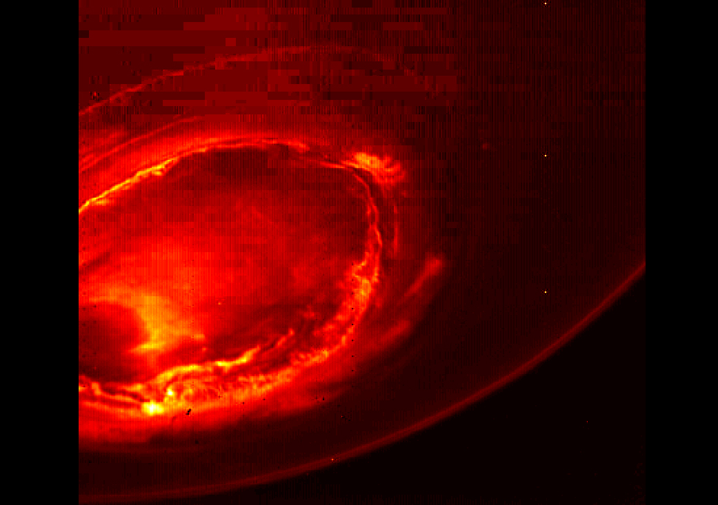 Juno Fotografa A Aurora Do Sul De Júpiter Por: Felipe Freires Essa imagem infravermelha nos mostra uma aurora do sul do planeta Júpiter, imagem feita pela sonda Juno no...
