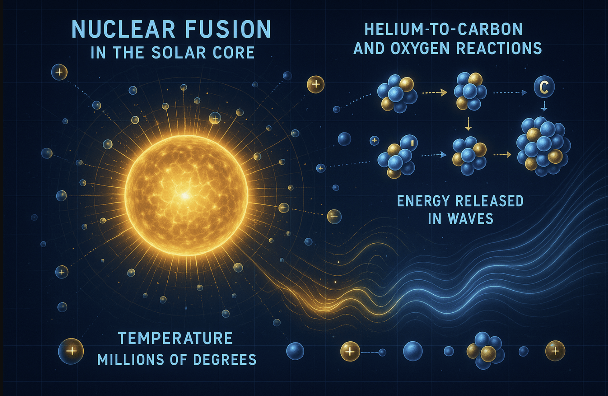 Quando o núcleo de hélio atingir uma massa crítica e uma temperatura suficientemente alta, novos tipos de fusão nuclear começarão a ocorrer. O hélio, que até então permanecia inerte como produto residual da fusão do hidrogênio, começará a se fundir para formar elementos mais pesados como carbono e oxigênio. Este processo, conhecido como queima do hélio, libera quantidades colossais de energia – muito mais do que a fusão do hidrogênio que sustentou o Sol durante a maior parte de sua vida.