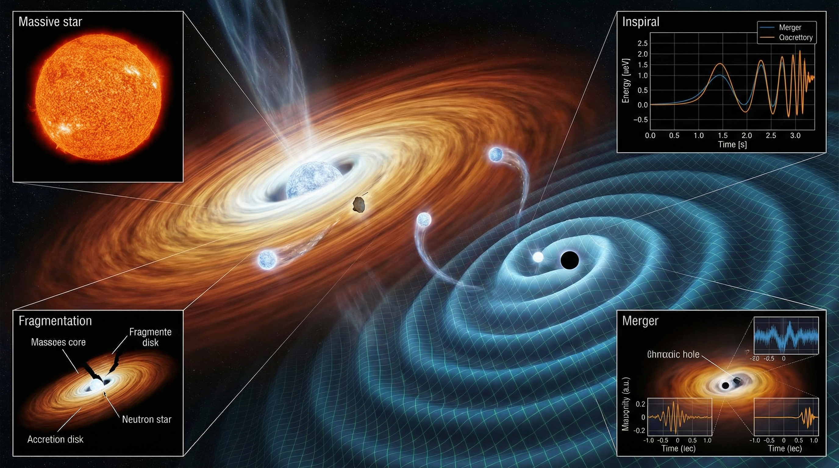 Um desses fragmentos poderia, teoricamente, ter massa suficiente para colapsar sob sua própria gravidade e formar uma segunda estrela de nêutrons, desta vez com massa subsolar, inferior a uma massa solar. Este objeto recém-nascido, ainda imerso no denso ambiente da supernova em explosão, seria então capturado pela gravidade do objeto central, seja ele a estrela de nêutrons primária ou um pequeno buraco negro formado pelo colapso do núcleo estelar. Em um curto espaço de tempo, variando de minutos a horas, os dois objetos compactos espiralariam um em direção ao outro, perdendo energia através da emissão de ondas gravitacionais, até finalmente se fundirem em um evento violento.