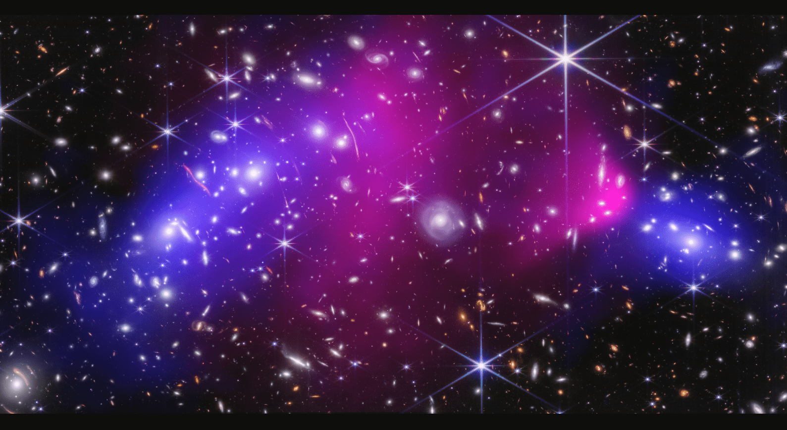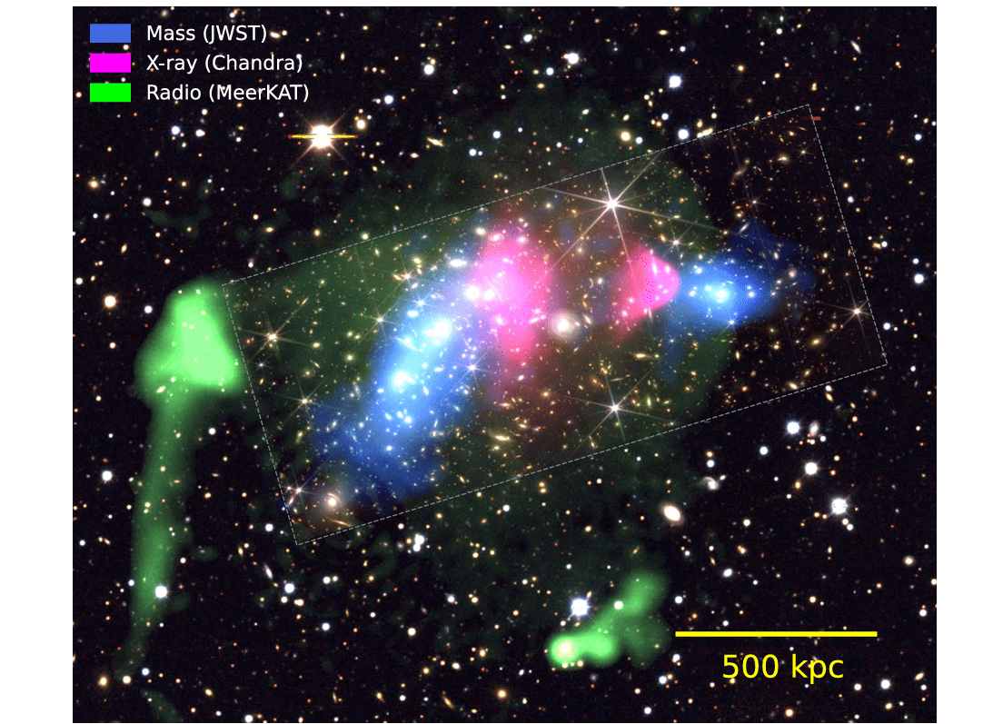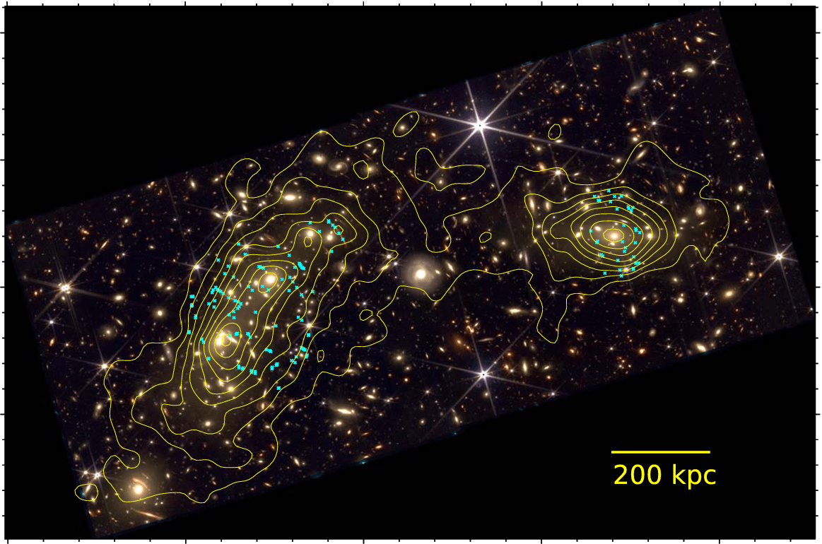 No subaglomerado, o pico de massa está deslocado por aproximadamente 150 kpc do núcleo do meio intracluster (a “bala”) ao longo do eixo de colisão. No aglomerado principal, deslocamentos ainda maiores são observados – aproximadamente 200 e 400 kpc das galáxias mais brilhantes do norte e sul, respectivamente. Estes deslocamentos são consistentes com estudos anteriores, mas a reconstrução de massa de forma livre, possibilitada pelas restrições aprimoradas de lente do JWST, aumenta substancialmente a significância estatística das dissociações observadas.