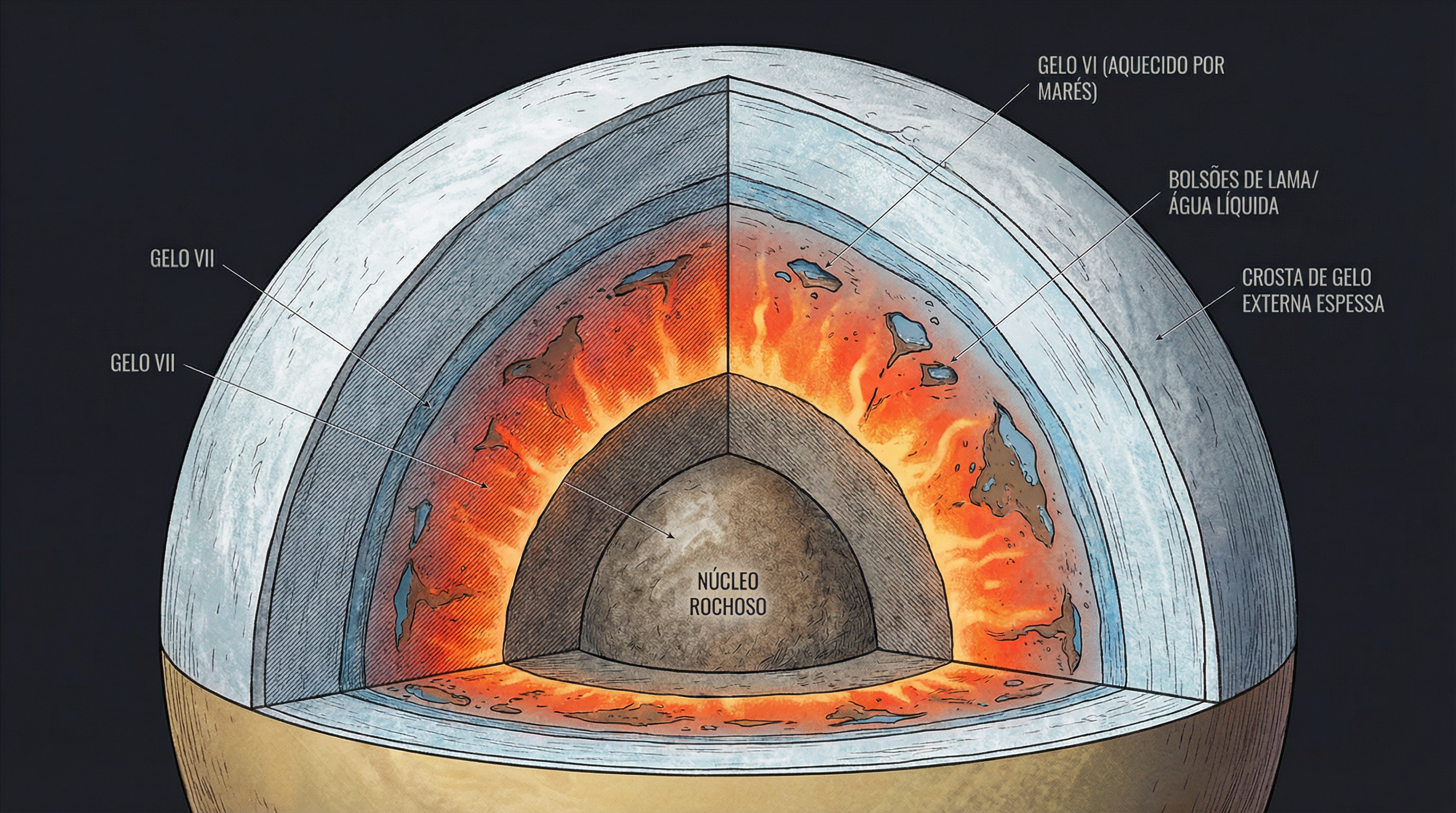Uma reanálise dos dados da sonda Cassini revela que a maior lua de Saturno, ao contrário do que se pensava, não possui um oceano global de água líquida, mas sim um interior geologicamente ativo repleto de gelo de alta pressão e bolsões de água.