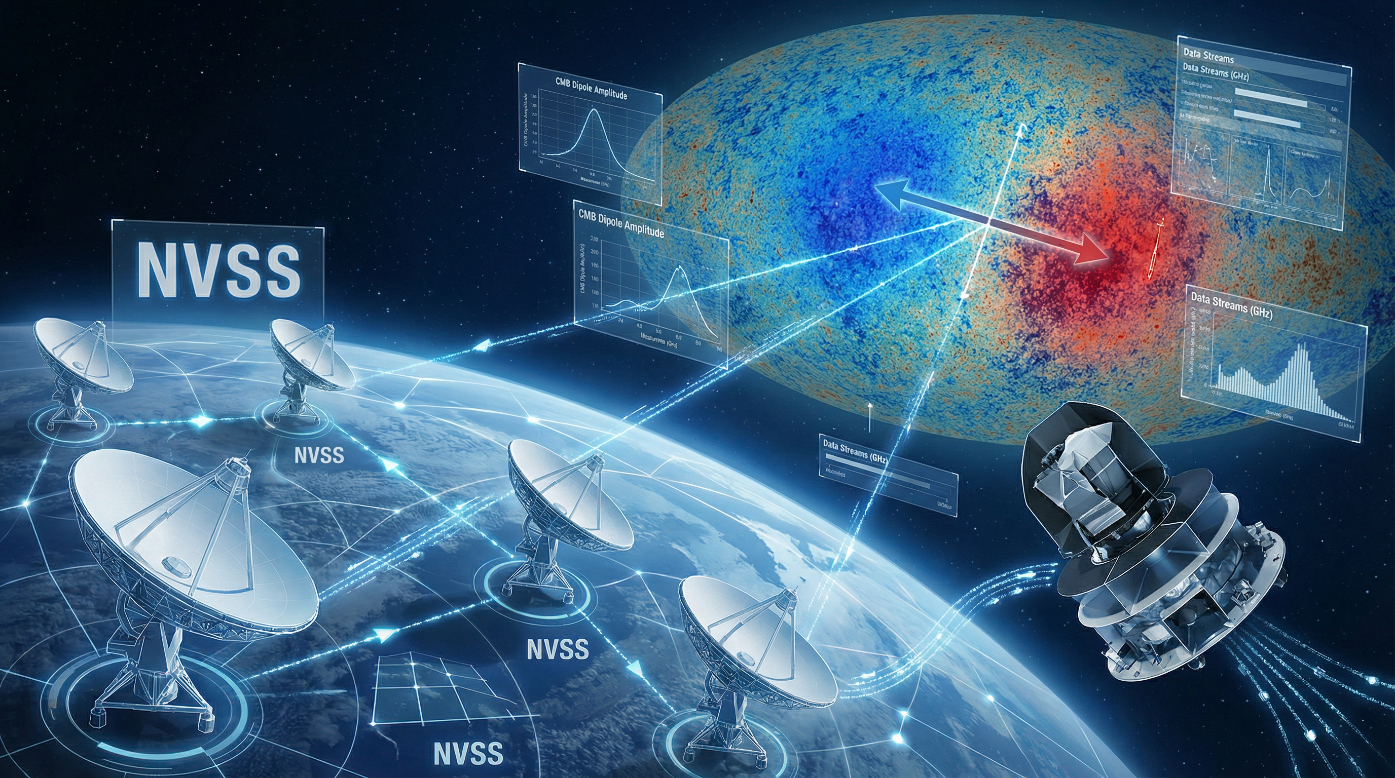 O problema surge quando tentamos verificar esta hipótese de forma independente. Em 1984, os cosmólogos George Ellis e John Baldwin propuseram um teste crucial. Se o dipolo da CMB é puramente cinemático, então qualquer observador se movendo junto conosco deveria ver um padrão dipolar semelhante na distribuição de fontes de rádio distantes, como quasares e radiogaláxias. Devido aos efeitos da aberração relativística (que faz com que as fontes pareçam mais concentradas na direção do movimento) e do brilho Doppler (que torna as fontes mais brilhantes e, portanto, mais fáceis de detectar), deveríamos observar um excesso de fontes na mesma direção do polo quente da CMB e um déficit na direção oposta. A amplitude deste dipolo na matéria deveria ser consistente com a amplitude do dipolo da CMB.